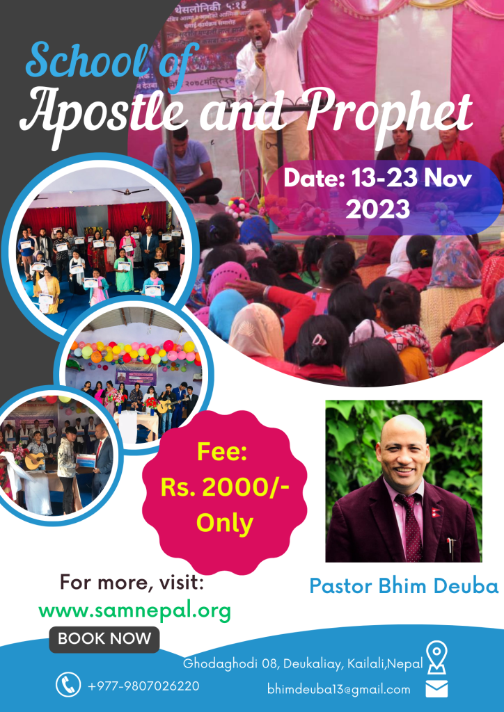 Hello everyone, Jaimasiha in the name of the Lord Jesus Christ. We are thrilled to announce that SAM Nepal will be hosting the dynamic School of Apostle & Prophet, a transformative event taking place from November 13th to 23rd. Join us at Ghodaghodi-08 Deukaliay in Kailali, Nepal, for an incredible opportunity to delve into the realms of Apostolic & Prophetic Ministry.